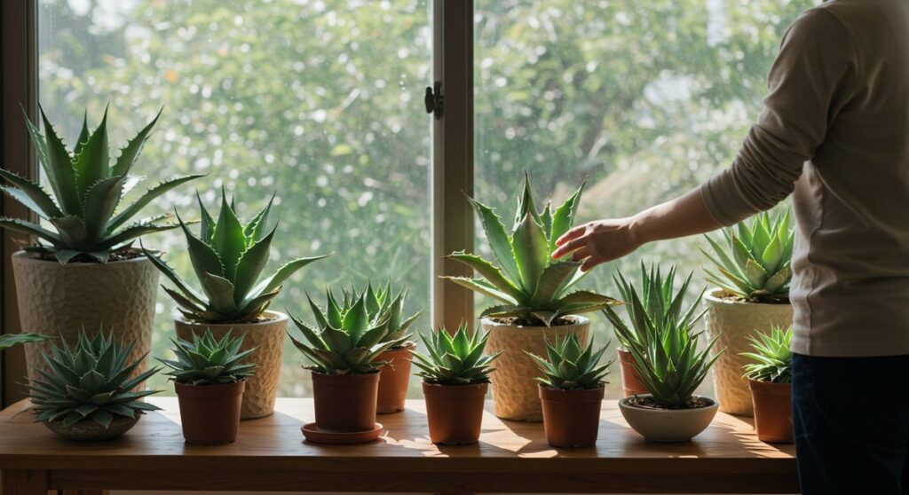 アガベは基本的に日光を好みます。屋内でも窓辺の明るい場所や屋外の半日陰〜日向が適しています。直射日光に慣れていない株は徐々に光に慣らすことが必要です。