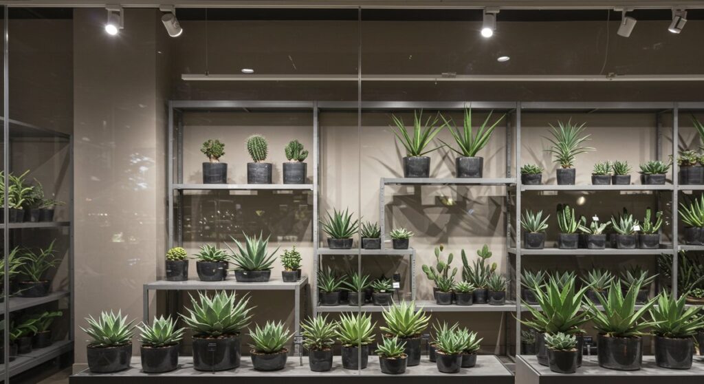 インテリアでアガベを映えさせるには、背景とコントラストを意識します。明るい壁の前に深緑のアガベを置くと引き立ちますし、モノトーンの空間には銀白色の品種が映えます。