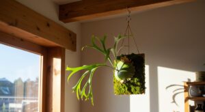 アルシコルネは板付けと鉢植え、どちらでも育てられますが管理が異なります。板付けは根が露出する分、乾きやすくこまめな水やりが必要です。湿度を保つために苔を巻いたり、霧吹きを活用するとよいでしょう。