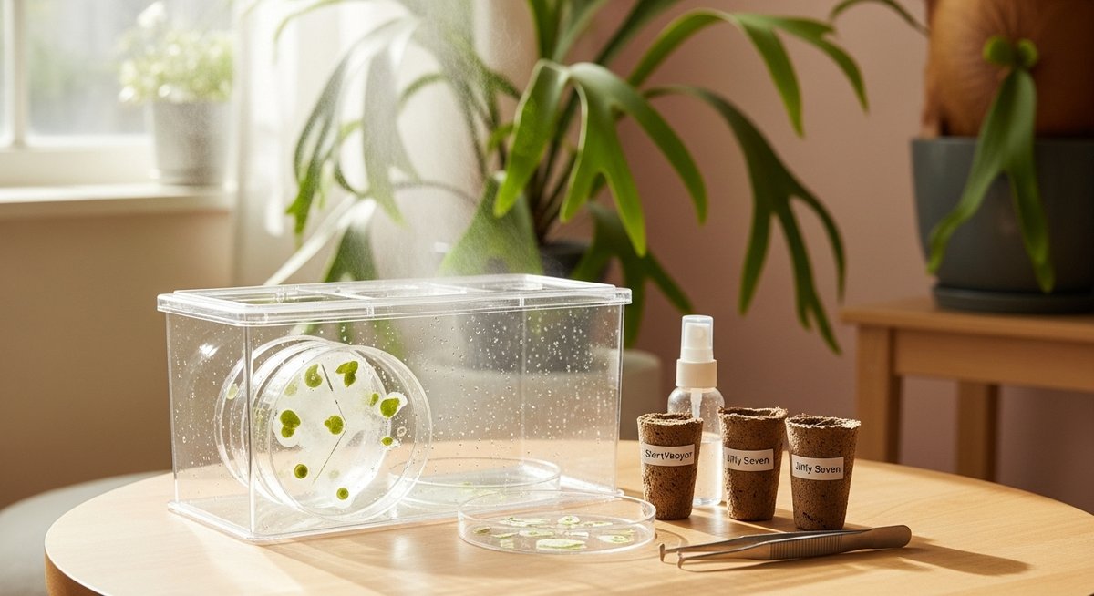 胞子培養では乾燥が最大の敵なので、容器を密閉して湿度を一定に保つことが重要です。フタつきのプラスチック容器や密閉トレーを用意し、培地の表面が常にしっとりした状態を維持します。