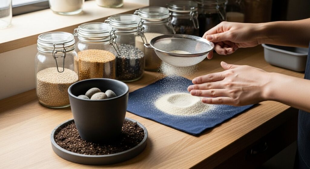 周囲の汚れや目詰まりを防ぐために、使用前に必ず「ふるい」にかけることをおすすめします。目の細かいふるいを使って黒い粉を落とし、さらにバケツなどで一度水洗いして汚れを流しておきましょう。