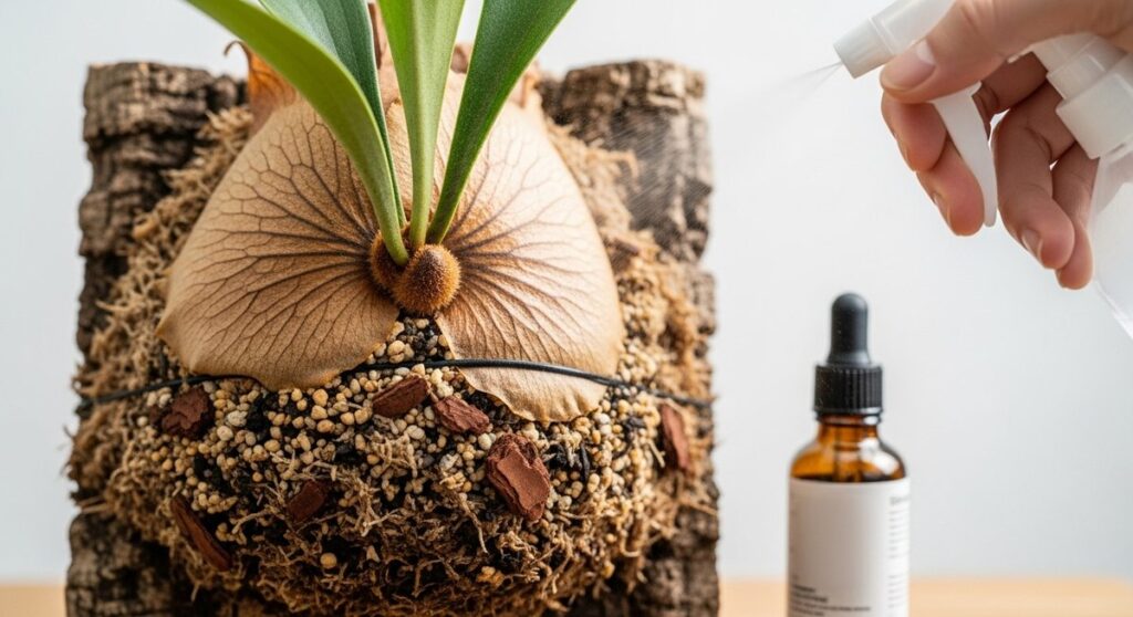 成長点が茶色い組織で覆われていることには、水分保持という極めて実用的な目的もあります。ビカクシダはもともと木に付着して生きる着生植物であるため、常に乾燥のリスクにさらされています。成長点がむき出しの状態ではすぐに干からびてしまいますが、茶色の密な組織があることで、内部の湿度を一定に保つことができるのです。
